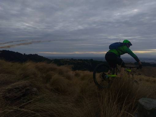Into the descent, hard to follow, and super super dry. Ridiculously dry in fact. Found our lines, but some were really hard to see, then, down the ridgey bit towards the rocky knob. Bit of a look for what I thought I could see from the Tors track - nope. And then Nelson did the tricky board drop thing while I took Nana's line, down and the up onto the razorback ridge. Excellent ride down this, one of my smoothest, and lower down the I swear I could smell the grass burning on our brake disks. Dropped on down to the pylon and under, over the gates, and around into the forest. To the left, and dropped into the jumpy droppy track. Checked out some of the new (stupid) lines, and then out the bottom and out the exit track, meeting a couple of (jump building?) young guys riding in.